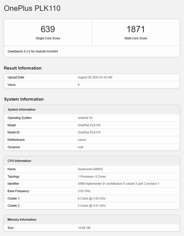 骁龙8 Elite Gen5目前已经确定将沿用“2+6”的八大核设计,其中两个超大核的主频高达4.61GHz,六个大核的主频也达到3.63GHz。这个数据的可信度还是很高的,因为其来源于Geekbench网站,基本上就是实测数据,测试设备则是OnePlus PLK110,大概率就是即将发布的一加15了。